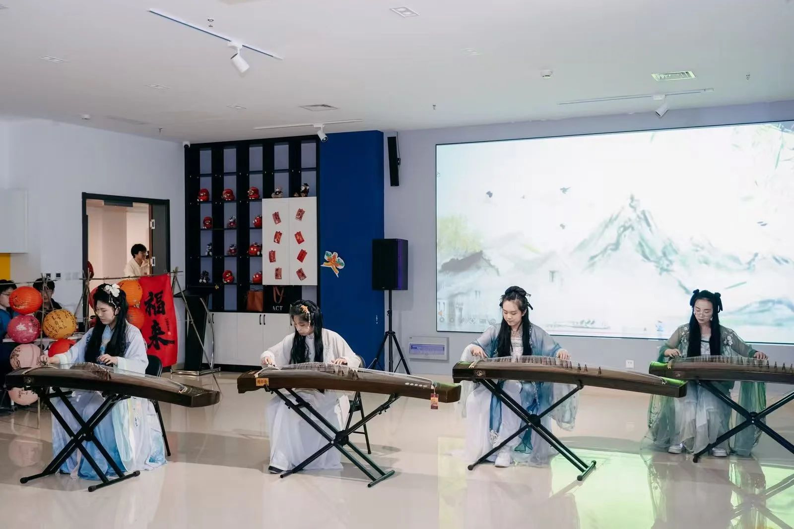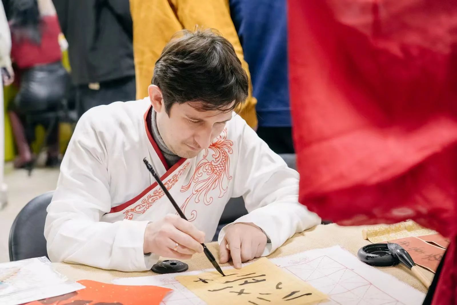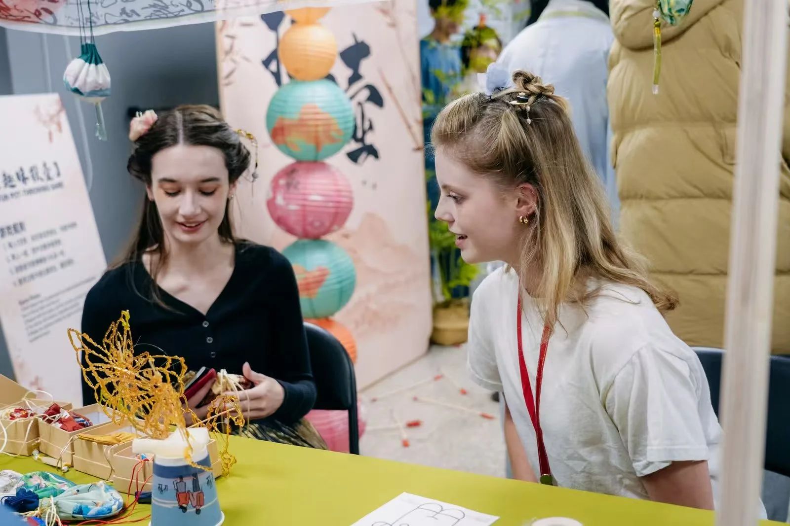 联欢会后,亚利桑那大学一行还参与了国风市集活动。国风市集围绕“琴棋书画”四大主题元素,设置了拍照打卡区、围棋比赛区、书法区、国画(纸鸢)创作区等,其中非遗漆扇制作、非遗扎染、糖画、手工香囊等传统手工艺展示区前吸引了许多师生驻足,亲自参与制作。