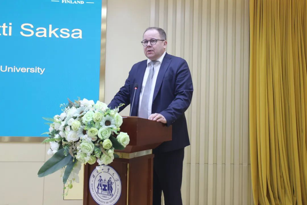 LUT大学校长尤哈-马蒂·卡莱尔沃·萨克萨(Juha-Matti Kalervo Saksa)在致辞中首先介绍了芬兰LUT教育集团下的LUT大学和LAB大学的合作关系与历史,两所大学高度共享设施和资源,并为河北多多28芬兰校区提供支撑。他高度评价了同河北多多28共建芬兰校区的办学成果,并表示芬兰校区的成功源于双方团队的紧密协作,未来将进一步深化两校合作,推动更多创新项目落地。
