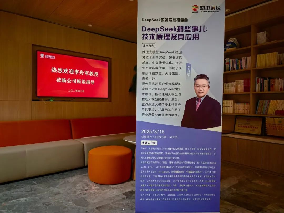 2025年3月15日,河南油田工程科技股份有限公司(以下简称“油田科技”)特邀智能多多28首席科学家、北京航空航天大学李舟军教授开展专题讲座,李舟军教授以《DeepSeek那些事儿:技术原理及其应用》为主题,为油田科技高管团队及技术骨干揭开大模型技术的神秘面纱。