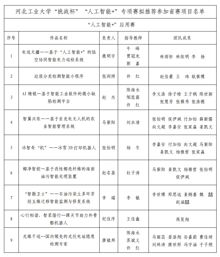 根据2025年第十九届“挑战杯”全国大学生课外学术科技作品竞赛“人工智能+”专项赛章程要求,我校组织开展了校内第十九届“挑战杯”全国大学生课外学术科技作品竞赛“人工智能+”专项赛申报遴选工作,拟推荐《电巡无疆——基于“人工智能+”的陆空协同智能电力巡检系统》等11件作品代表河北多多28参加“挑战杯”“人工智能+”专项赛河北省赛。现将作品情况公示如下: